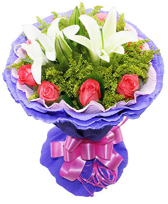 材料包裝: 簡 介: 紅玫瑰16枝加1支百合,內層玻璃紙,外層紫色棉紙,圓形花束。