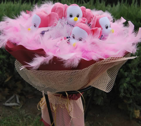 材料包裝: 花材:6只卡通粉色小猴 包裝:棗紅色瓦楞紙圓形包裝,米色紗網外圍,粉色羽毛裝飾,拉菲草束扎