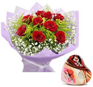 商品簡介:花 材:[9枝紅玫瑰,搭配綠葉,滿天星適量點綴]+[109克德芙心型禮盒巧克力,根據本地巧克力可能會有所不同,但保證同等價值]