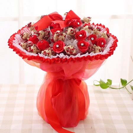 商品簡介:公仔數(shù)量:21只8CM高檔熊+21香皂花 材料:蕾絲,紗,卷紙,香皂,鉆飾,絲帶。尺寸:高45CM,直徑45CM