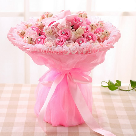 商品簡介:公仔數(shù)量:21只8CM高檔熊+21香皂花 材料:蕾絲,紗,卷紙,香皂,鉆飾,絲帶。尺寸:高45CM,直徑45CM
