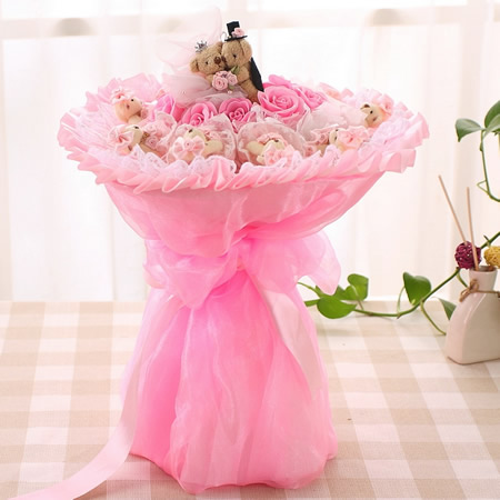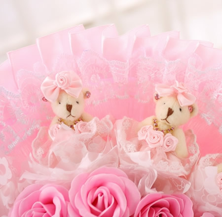 材料包裝: 公仔數量:1對婚紗高檔熊+9只小熊+9朵香皂花 材料:蕾絲,紗,卷紙,香皂,鉆飾,絲帶 尺寸:高45CM,直徑40CM