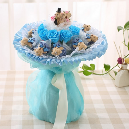 材料包裝: 公仔數(shù)量:1對(duì)婚紗高檔熊+9只小熊+9朵香皂花 材料:蕾絲,紗,卷紙,香皂,鉆飾,絲帶 尺寸:高45CM,直徑40CM