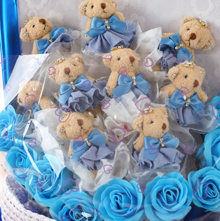 材料包裝: 公仔數量:9只8CM高檔蕾絲熊+9朵香皂花 材料:霧光紙,雪紗,絲帶 尺寸:高50CM,直徑35CM