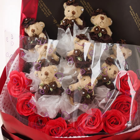 材料包裝: 公仔數(shù)量:9只8CM高檔蕾絲熊+9朵香皂花 材料:霧光紙,雪紗,絲帶 尺寸:高50CM,直徑35CM